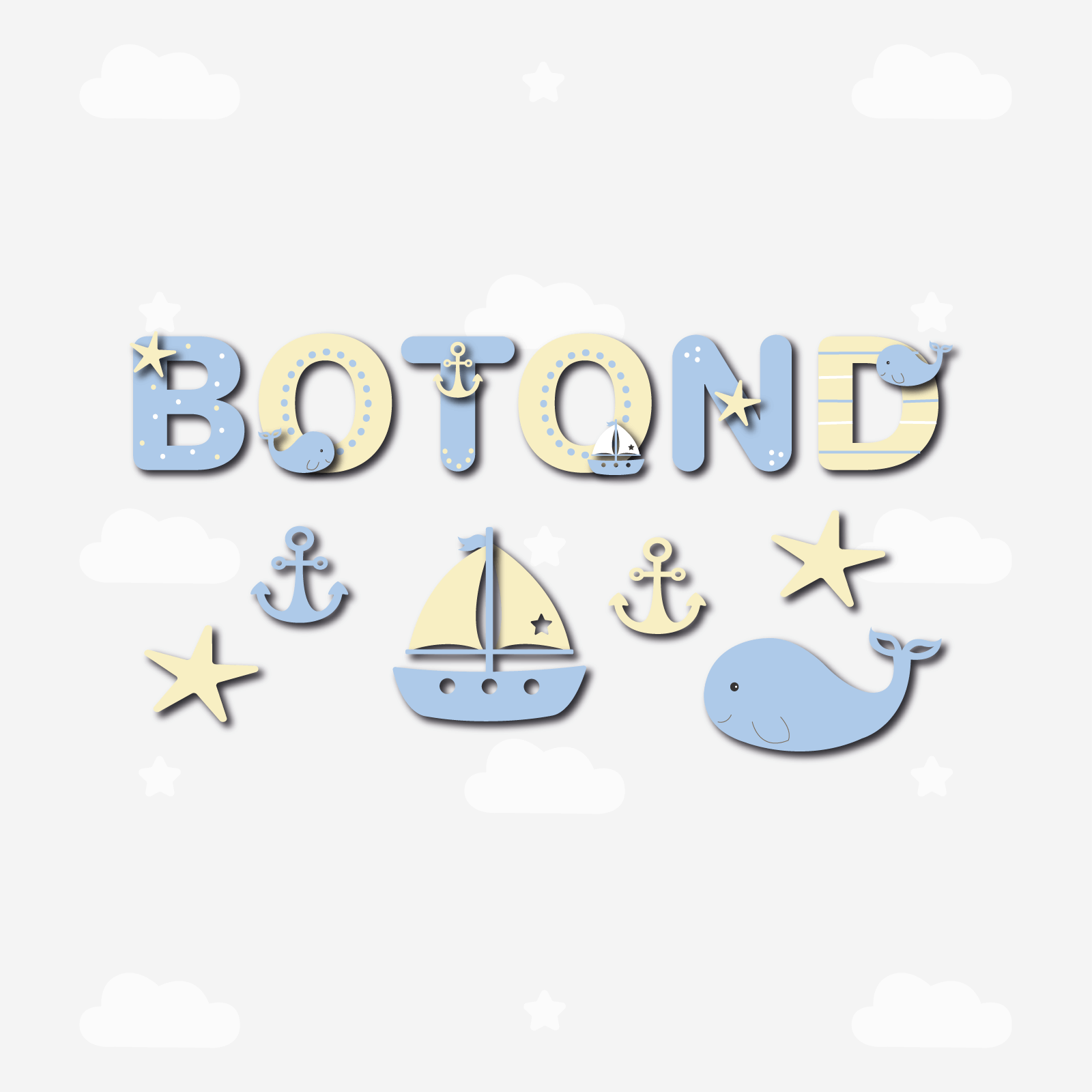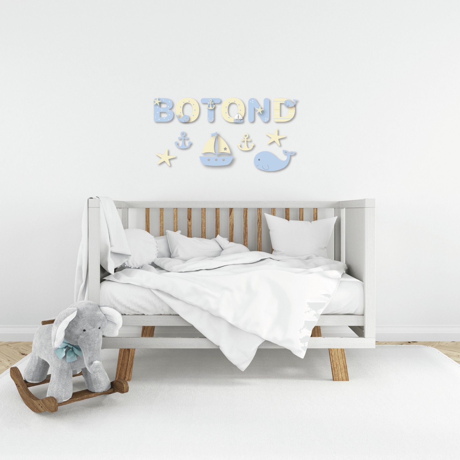 Személyre szabott, egyedi névtábla fából, sárga és kék színekben, csillag, kishajó, bálna és horgony motívumokkal