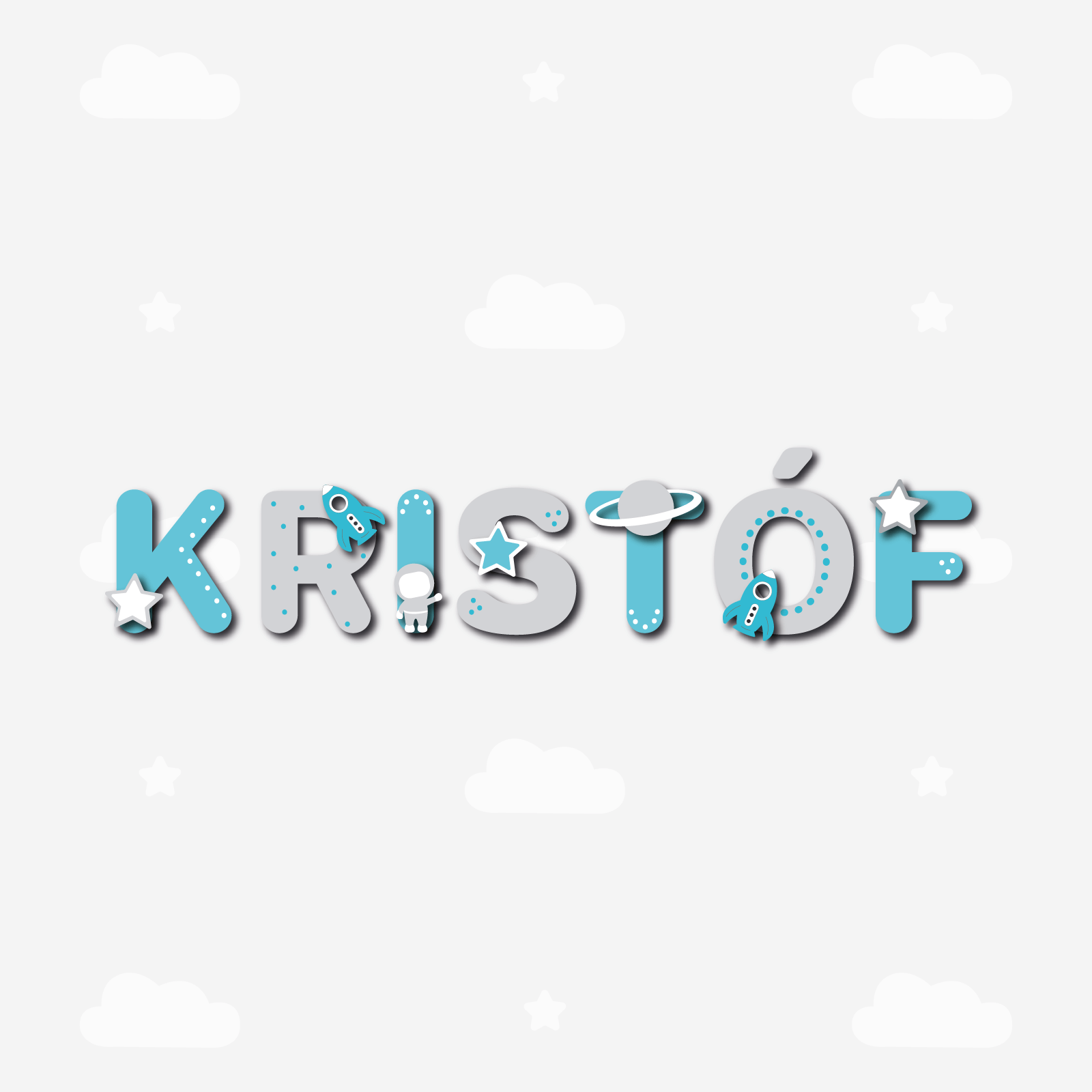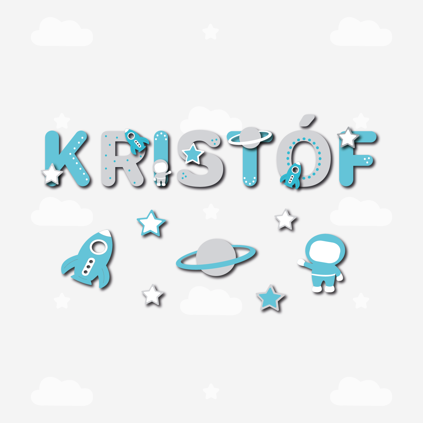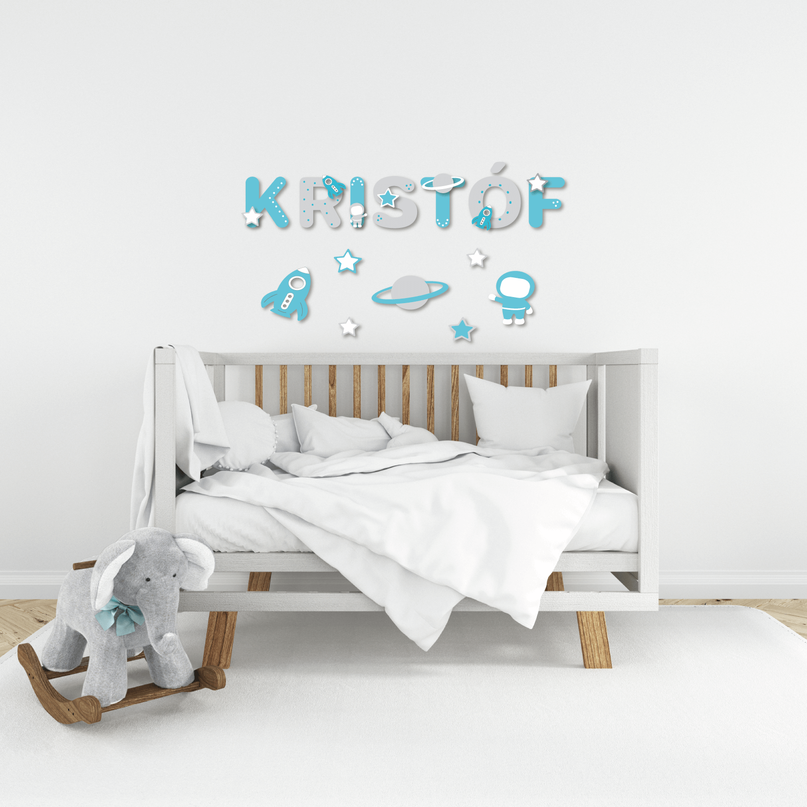 Személyre szabott, egyedi névtábla fából, szürke és türkiz színekben, csillag, rakéta, űrhajós és bolygó motívumokkal